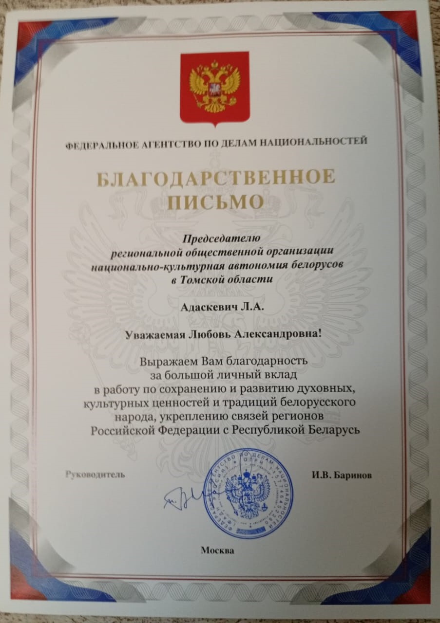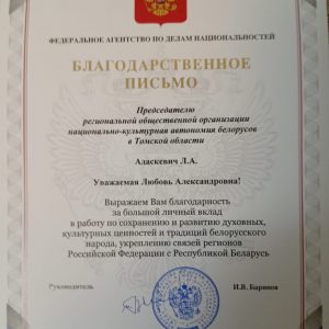 Необходимо отметить то, что Любовь Александровна Адаскевич была переизбрана в состав Совета ФНКА Белорусов России.