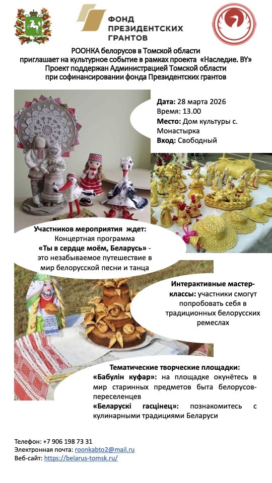 Реализуемый социально – значимый проект «Наследие.BY» поддержан Администрацией Томской области при софинансировании фонда Президентских грантов, станет ярким праздником для всех жителей и гостей.