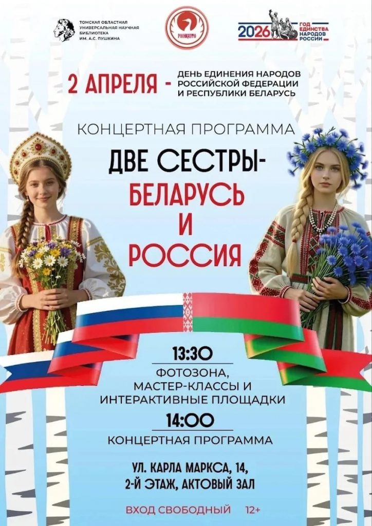 В 13:30 в холле актового зала томские белорусы организуют фотозону, мастер-классы и интерактивные площадки, где посетители смогут познакомиться с культурой и традициями белорусского народа.